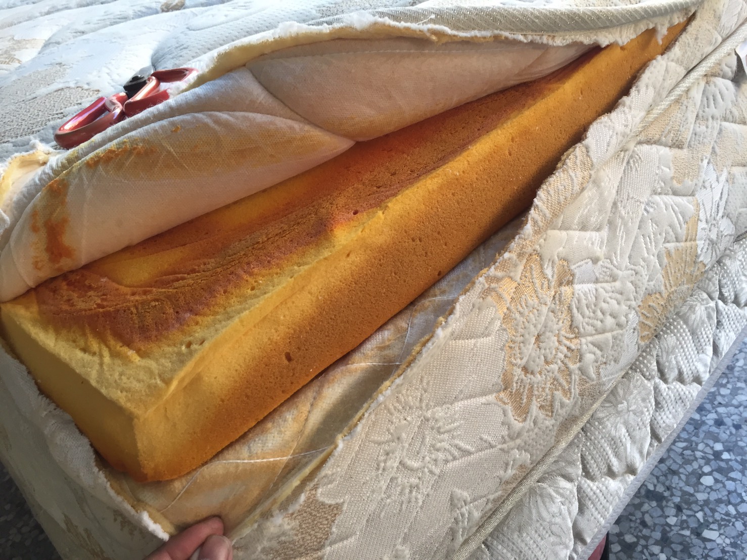近日有位客人購買了我們的 924 型獨立筒床墊,並請我們協助拆解他的舊床墊。 客人表示,這張舊床墊是當初結婚時